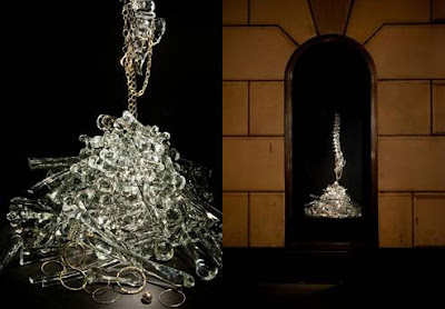 The shelter reliquary is now on view in a window at Bergdorf Goodman. The entire body is seen as the ultimate shelter only that here the only thing left standing is the spine while the bones have all fallen away. The spine represents the resilience of the human spirit and our faith in rebuilding (the video footage has not been included in the current installation).